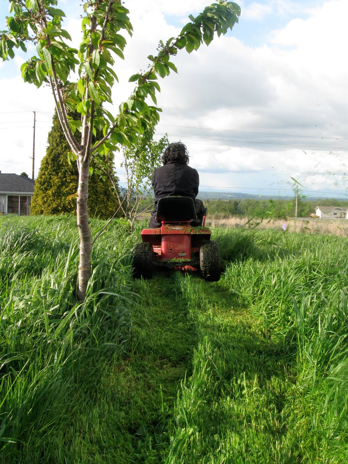 The Bellingham Herald reports there have been four cases of human poisonings from the above plant this year. One fatality. The Herald reports that people mistake Hemlock for carrot or anise, and provides a detailed description to help people avoid making the mistake: Poison hemlock (Conium maculatum) was introduced to the U.S. from Europe as an ornamental plant. It has adapted to a wide range of climates and grows along roadsides and waterways, in pastures and playgrounds, in vacant lots and cracks in the pavement. "This plant is very adaptable," Baldwin said. Its stem is hollow, and the erect biennial is usually 4 to 6 feet tall. The numerous flowers are white. Its leaves are lush, and look like a cross between Italian parsley and a fern. All parts of the plant are poisonous and affect the nervous system. Initial symptoms could include a burning sensation in the mouth, nausea, confusion, and muscle paralysis. Baldwin said the smooth and hairless stem with purple spots near the base are sure-fire indicators of poison hemlock. It spreads by seed. When crushed, the plant has an unpleasant odor that has been describe as musky or smelling like mouse urine. This smell is what makes me wonder how anyone could mistake it for carrot. Carrots smell good: Hemlock stinks like hell. Those of you with long memories will remember my years-long battle with this evil weed (Philosopher's Bane) . It's a battle I've been slowly losing, I'm afraid. Over the years, the Hemlock has been stealthily expanding it's range, while I have only been getting older and stiffer, which makes it much harder to stoop over and pull it's devilishly long taproot. Here's what I had to say about Hemlock back in 2008: I really dislike this stuff. It's seriously poisonous, poisonous enough to pose a real hazard to animals and small children; it spreads like wildfire; it's hard, backaching work to try to pull it out by the roots, it stinks horribly and gives me hives, and if all that weren't enough, it grows in inaccessible places, like in the middle of thistle patches and along the fence line amidst the concrete rubble from the old barn. Every time I go wage a battle against the poison hemlock, I come back scratched, red, bumpy, itchy, and limping. I may eventually need to call in the cavalry: Roundup. Well, I realize I have tied one hand behind my back here, but I have NOT called in the chemical cavalry, nor do I intend too. As far as I'm concerned, Monsanto is a far greater evil being than Hemlock is. Neither do I have the equipment (or the money to rent same) needed to disk the whole field, till, and plant new grass the way professionals do. No, it's just me, my aching back, and the pathetic old Murray lawnmower, which really deserves it's own label in this screed, considering the length and complexity of its ongoing saga. In the last installment of the lawnmower saga, Homero fixed the machine for the umpteenth time and bought a new battery for it. That means it actually starts without having to drag a car battery and jumper cables out to wherever it was when it died last time. It means that I am actually capable of starting it myself and cutting the grass without asking my husband for his manly assistance. Today I decided I would take the irascible machine out to the back pasture and try to mow as much Hemlock as I could. I would have to be extremely careful as there are still - despite several hours of really hard work with a crowbar - many large rocks imbedded in the ground and any one of them would kill the mower if I ran over it, not seeing it amongst the tall poisonous plants. Oh the many perils that exist in one small field! The idea, which is not exactly supported by experience, is that repeated mowing of the plants before they flower and go to seed will prevent them from spreading, at least. Well, I managed to mow for a good thirty minutes, and I did mow down a large expanse of young hemlock plants. I felt pretty good. I felt pretty successful. I got ambitious and decided to go out to the other large patch of hemlock out by the fence. Now, this was dangerous because there is a steep drop-off right along the fenceline. The hemlock - along with stinging nettle and blackberry - grows down into this small ravine right up to the fence. Obviously, I was going to stay up on the plain and just get as much as I reasonably could get with the riding mower. The stuff down in the valley would have to be got with a weedeater. Do you see where we are going here? No no, not quite. I didn't drive right over the edge. But I did try to get too close and the mower started to slide sideways. I put on the brake, threw it in reverse, and tried to back up but I only backed up a half a foot or so before something stopped me. I thought that might be enough, so I put in the lowest forward gear and leaned my weight hard to the right and tried to go forward. No soap; the wheels spun and the machine started to tip sideways again. After a couple more equally ineffective tries, I couldn't think of anything to do but kill the motor and hop off - right into a patch of stinging nettle, I might add - before the whole operation quite literally went south. Slightly scratched, with stinging ankles, and rather annoyed with myself, I stomped off to the shop to tell my husband I was going to need his manly assistance after all.